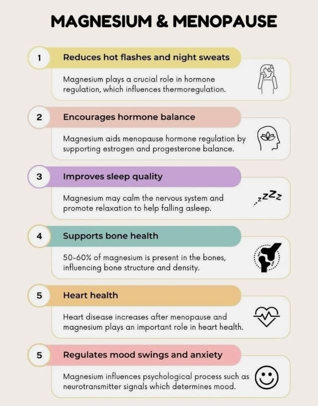 Magnesium relaxes muscles and prevents leg cramps and restless legs, which are common in menopause.